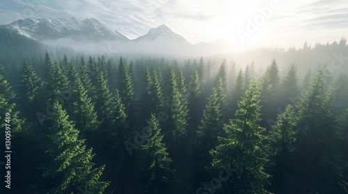 A dense forest of tall, green pine trees in the mountains
