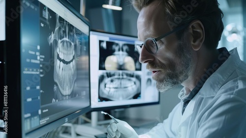 A dentist intently viewing a computer screen with a tooth Xray, assessing the image to evaluate dental conditions and determine the appropriate care