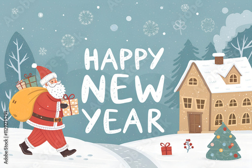 A design for Happy New Year card, banner, backdrop with HAPPY NEW YEAR texts in the center, around by stars and snowflakes