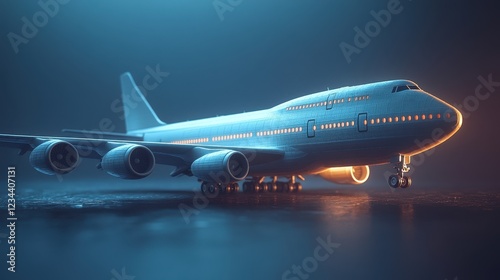 A detailed 3D model of a large airplane with dramatic lighting.