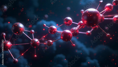 A detailed close up of a red molecular structure against a dark blue cloudy background design art