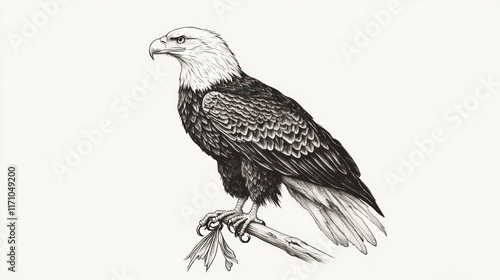 A detailed illustration of a bald eagle perched on a branch.