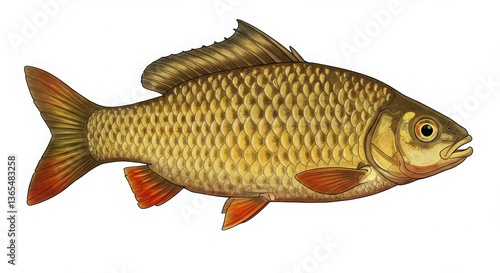 A detailed illustration of a common carp, showcasing its golden scales and vibrant orange fins against a stark white background.