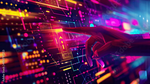 A detailed illustration of a hand interacting with a touch screen interface pressing a digital button