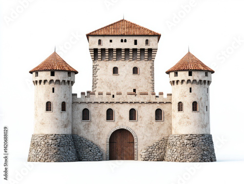 A detailed medieval castle featuring stone walls, towers, and a wooden gate, set against a plain background, showcasing classic architectural design.