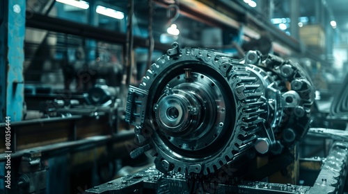 A detailed view of a complex engine part in a bustling industrial setting, showcasing mechanical prowess.