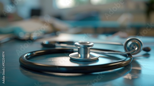 A detailed view of a medical instrument used for listening to heartbeat and internal sounds, placed on a flat surface
