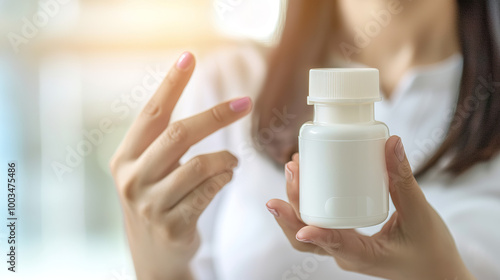 A determined woman holding a small bottle of weight-loss pills, focusing intently on the product. The scene is set in a minimalist, well-lit room with a blurred background and soft lighting, emphasizi