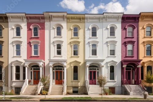 a diagonal shot of italianate facade with rounded windows