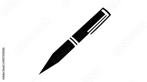 A diagonally displayed black pen is set against a white backdrop. Simple, clean design