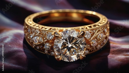 A diamond ring on a velvet cushion, capturing the play of light and shadow