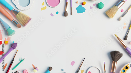 A digital illustration , frame features Art Supplies of painting tools like brushes and palettes with white space in the center for text or logo .