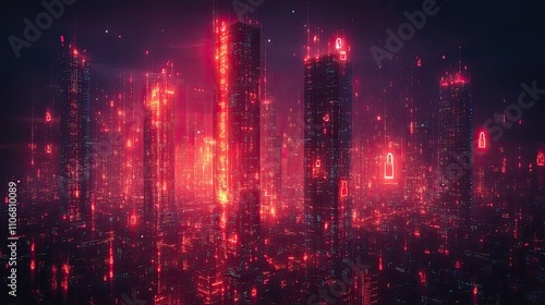 A digital cityscape with a skyline featuring multiple padlock icons symbolizes security and data protection in the modern world, highlighting the importance of cybersecurity
