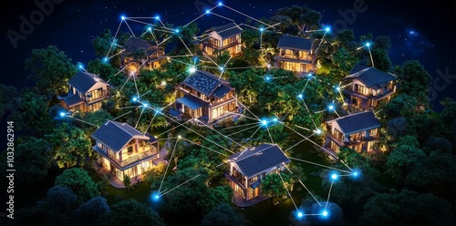 A digital community concept with smart homes and a digital community. DX, IoT and the concept of the digital network in society. Skyline with suburban houses at night. Hand edited generative AI.