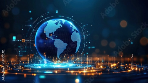 A digital globe with a futuristic network interface highlights global connectivity in a high-tech, cybernetic environment.