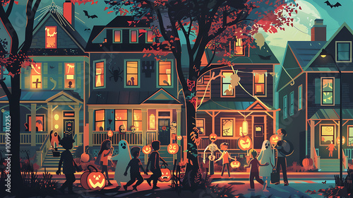 A digital illustration of a group of children in Halloween costumes trick-or-treating in a colorful suburban neighborhood