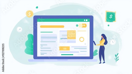A digital illustration of a laptop displaying a financial dashboard with a person interacting.