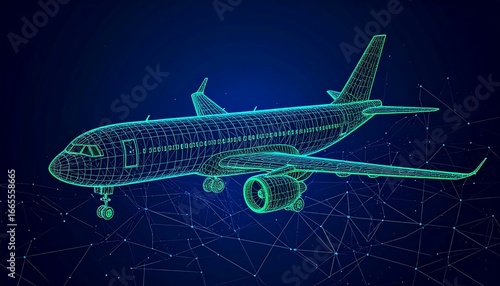 A digital illustration of an airplane in a wireframe style, with a modern design and glowing teal lines.