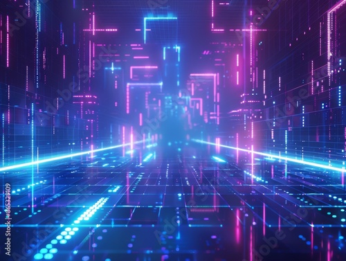 A digital landscape featuring a grid of blue light lines, creating a sense of depth and perspective
