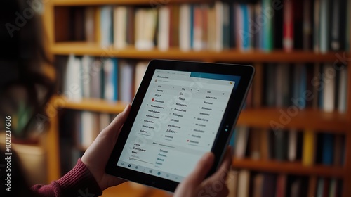 A digital reading list app on a tablet, displaying upcoming books to read, with notes and reminders