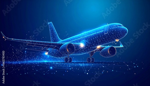 A digital, stylized illustration of an airplane in flight, depicted using a network of interconnected lines and points.