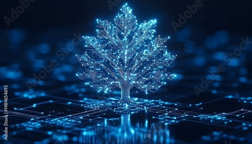 A digital tree, rendered in a blue glow, stands on a circuit board background