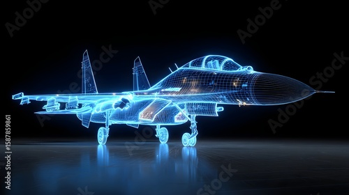 A digital wireframe hologram of a fighter jet on a dark tarmac, glowing blue with detailed lines, showcasing modern aerospace design