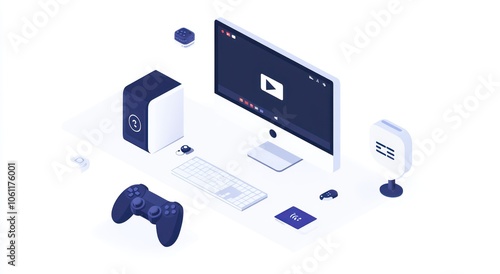 A digital workspace featuring a computer, gaming controller, and accessories.