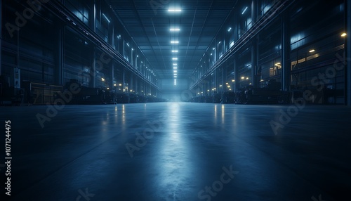 A dimly lit industrial warehouse with reflective floors and bright overhead lights, creating a mysterious and expansive atmosphere.
