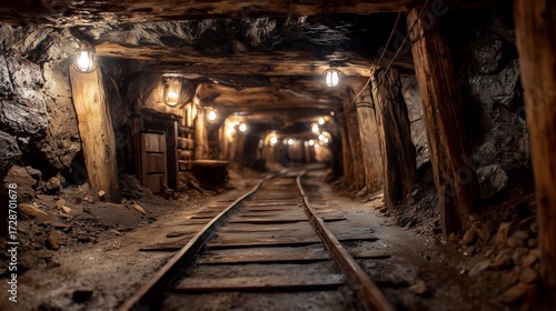 A dimly lit mine shaft with a railway track disappearing into the distance, lined with wooden support beams and glowing lamps, concept for historical reenactment, industrial exploration and