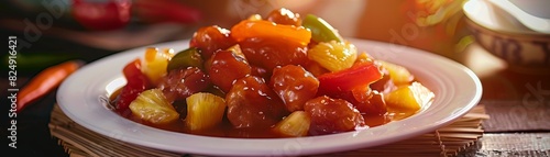 A dish of sweet and sour pork with colorful bell peppers and pineapple chunks in a Chinese family restaurant