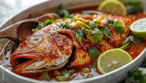 A dish of whole steam fish in red chili sauce with lime and coriander leaves