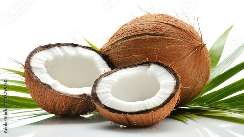 A display of a whole coconut next to a halved one, with fresh, smooth coconut flesh and natural coconut aroma, on a pristine white background.
