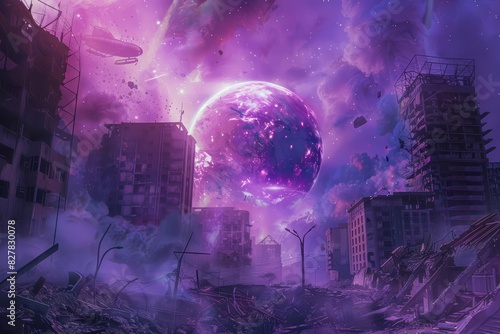 A distant galaxy collides with Earth, engulfing the planet in vivid purples and blues, within an abandoned city with blurry background, scifi photo, Sharpen banner