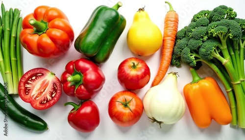 A diverse assortment of fresh vegetables arranged neatly against a clean white background, assortment, produce