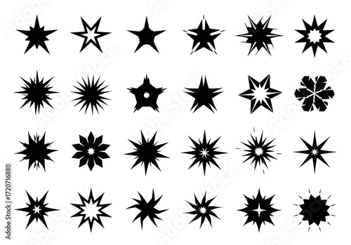 A diverse collection of star shapes and starbursts presented in a graphic design.