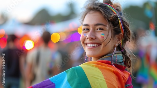 A diverse group of friends smiling and posing for a selfie with vibrant rainbow flags waving in the background during a lively LGBTQ celebration