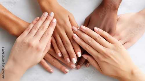 A diverse group of hands resting atop each other, showcasing various skin tones and manicured nails, symbolizing unity and collaboration.