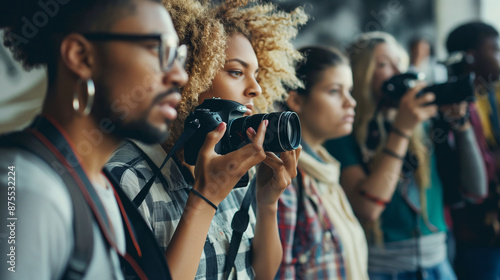 A diverse group of photographers sharing their portfolios and discussing techniques with copy space