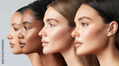 A diverse group of women using different skincare products, representing various skin types and ages, all with healthy, glowing complexions, promoting inclusivity and personalized skincare