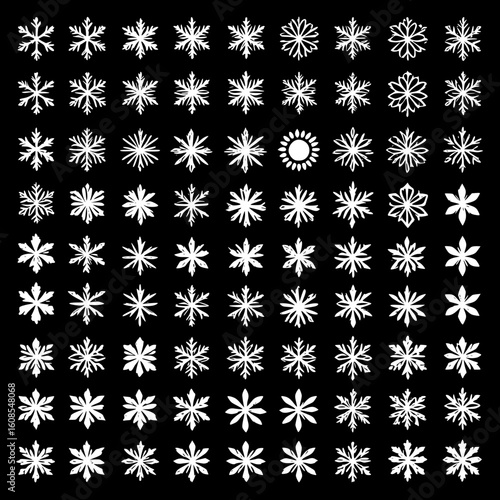 A diverse set of detailed white snowflake icons on a black background. This collection shows a variety of unique winter crystal patterns, perfect for holiday and seasonal graphic design projects.