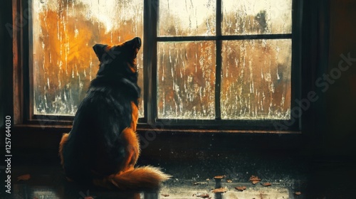 A dog sitting by the window, looking out curiously at the world beyond, its tail gently wagging as it watches the rain fall, creating a peaceful and reflective atmosphere