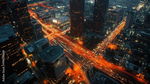 A dramatic aerial view of the downtown skyline at night, with illuminated streets and vehicles creating vibrant trails of light.