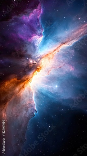 A dramatic and colorful cosmic nebula with vibrant hues of purple, orange, and blue, illuminated by a bright light source, set against a backdrop of countless s