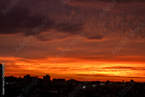 A dramatic and fiery orange sunrise burns over a city skyline. The dark silhouettes of urban buildings contrast against the vibrant, colorful sky, creating a beautiful atmospheric landscape.
