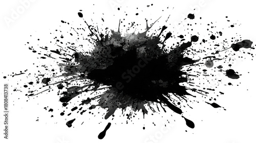 A dramatic black paint splatter with dynamic, radiating droplets and a central dark area, creating an explosive visual effect.