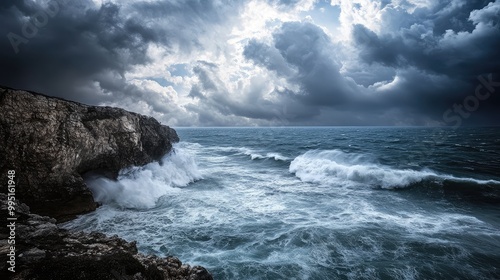 A dramatic cliffside view of the ocean during a storm