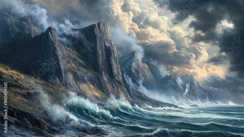 A dramatic coastal landscape with rugged cliffs and crashing waves under a stormy sky.