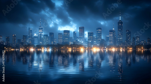 A dramatic nighttime cityscape with a moody sky and reflection of the city lights on the water.