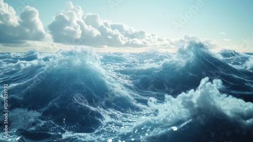 A dramatic ocean scene with crashing waves and a light blue sky.